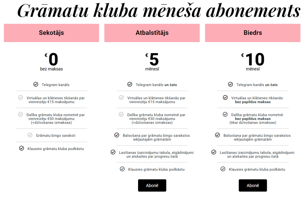 - Biedrs: Šī ir iespēja ciešākai un aktīvākai dalībai mūsu kopienā, turklāt visus kluba pasākumus varēsi apmeklēt bez papildus maksas – tie iekļauti abonementa cenā.