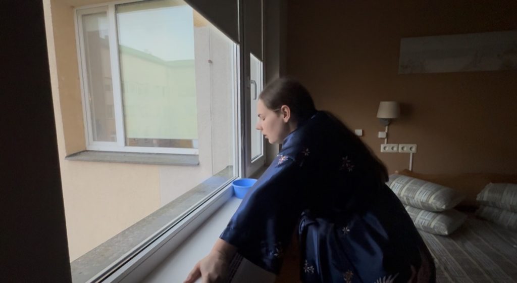 14:40 Ceļos no diendusas ar domu iet vannā, jo joprojām jūtos čābīgi – jau nedēļu esmu saaukstējusies. Man klepojot negaidīti noiet ūdeņi, lai gan šodien tikai apaļas 38 nedēļas. Jūtos absolūti sirreāli. Smejos. Piezvanu vecmātei Mārai. Haotiski mēģinu kaut ko vēl sakrāmēt dzemdību somā. Sāku just sāpes un atmetu visam ar roku, kāpju vannā.